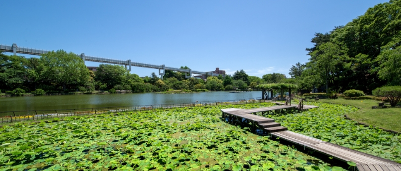 千葉市中心部に位置する約16haの総合公園で、春の桜、秋の紅葉など、四季折々の自然にふれられるのが魅力。なかでも初夏(6月上旬〜7月上旬)に見られる、世界最古の花といわれるオオガハスは必見だ。