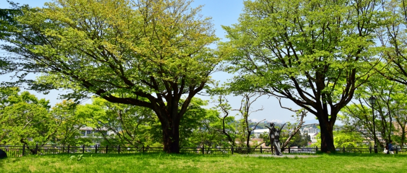 仙台市博物館の近隣に2023年開館した仙臺緑彩館。その敷地内には伊達政宗公の胸像が立っている。実はこの像、太平洋戦争時の金属類回収令により溶かされるはずだった銅像が、戦後上半身だけ発見されたもの。現在は精巧な政宗公の顔を間近で見られるとあって、ひそかな人気スポットになっている。