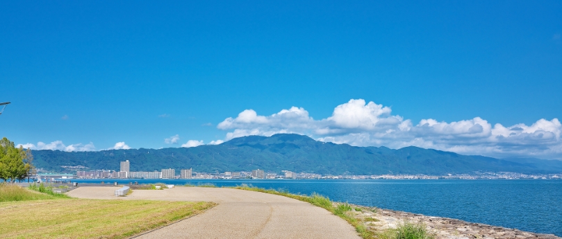琵琶湖岸沿いに整備された全長4.8kmの公園。四季折々の花が咲くなぎさのプロムナードをはじめ、砂浜を歩けるサンシャインビーチなど、ウォーキングに最適な爽快感ある湖岸ルートが続く。